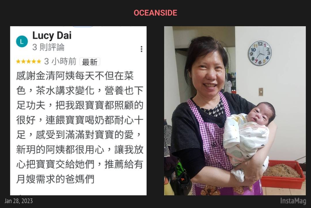 媽咪感謝函 好站連結 產後照顧 哺乳問題 手工母乳皂 培訓課程 美味月子餐 育兒新知 海外坐月子 首頁 > 媽咪新知 媽咪感謝函 中和戴小姐給金清阿姨五顆星 2023.01.30 謝謝中和戴小姐為金清阿姨寫五星評論。事實上這是由24小時柔眉阿姨和9小時金清阿姨共同接力完成的案子。 ‘’新玥的月嫂都很用心,讓我放心把寶寶交給她們,推薦給有月嫂需求的爸媽們‘’ 真心感謝戴小姐的推薦。