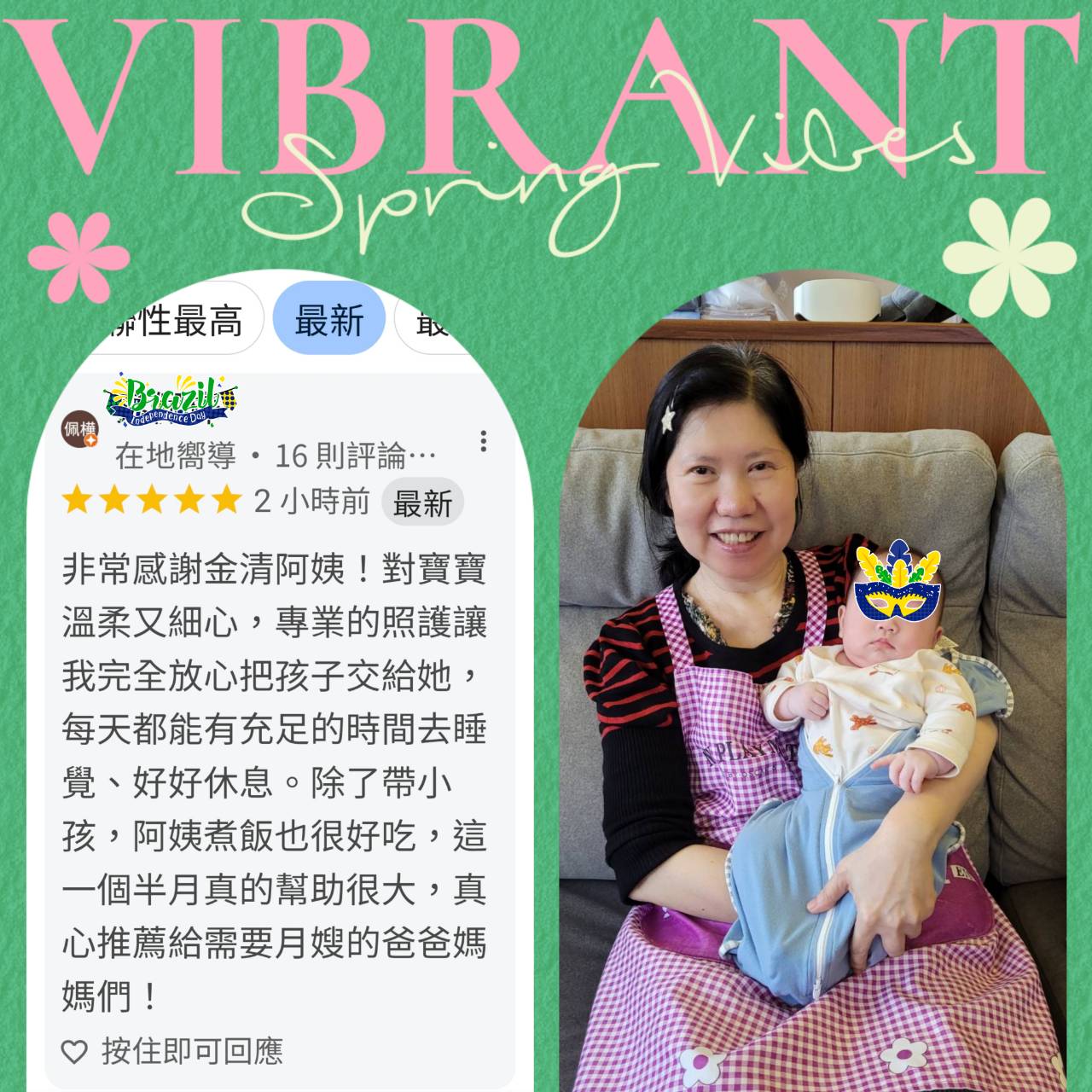 謝謝新店蔡小姐大推白天9小時中和金清阿姨,由原先約定的20天加到37天,肯定擁有充足的時間恢復元氣.金清阿姨13年月嫂經驗溫柔細心煮餐好吃,絕對讓媽咪很放心.